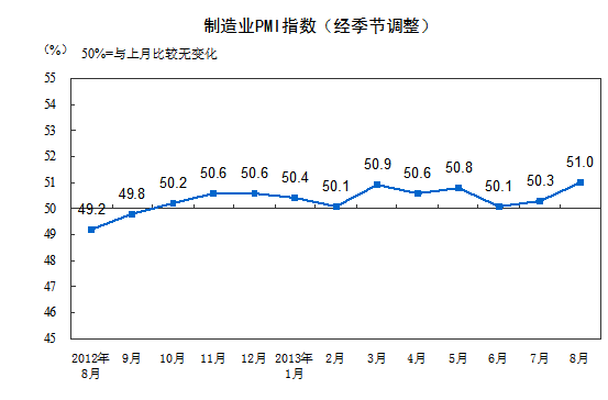 2013年8月,中國制造業(yè)采購經(jīng)理指數(shù)(PMI)為51.0%,比上月上升0.7個百分點,連續(xù)11個月位于臨界點以上。